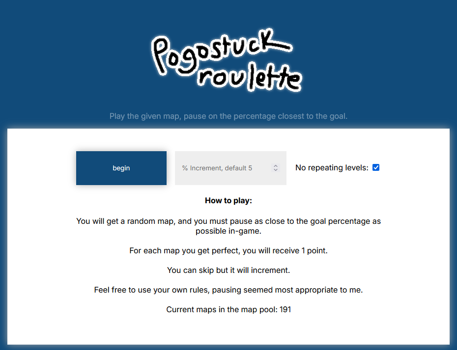 An external fun minigame to a Steam game called Pogostuck which picks out user-generated custom maps from the Steam Workshop at random.